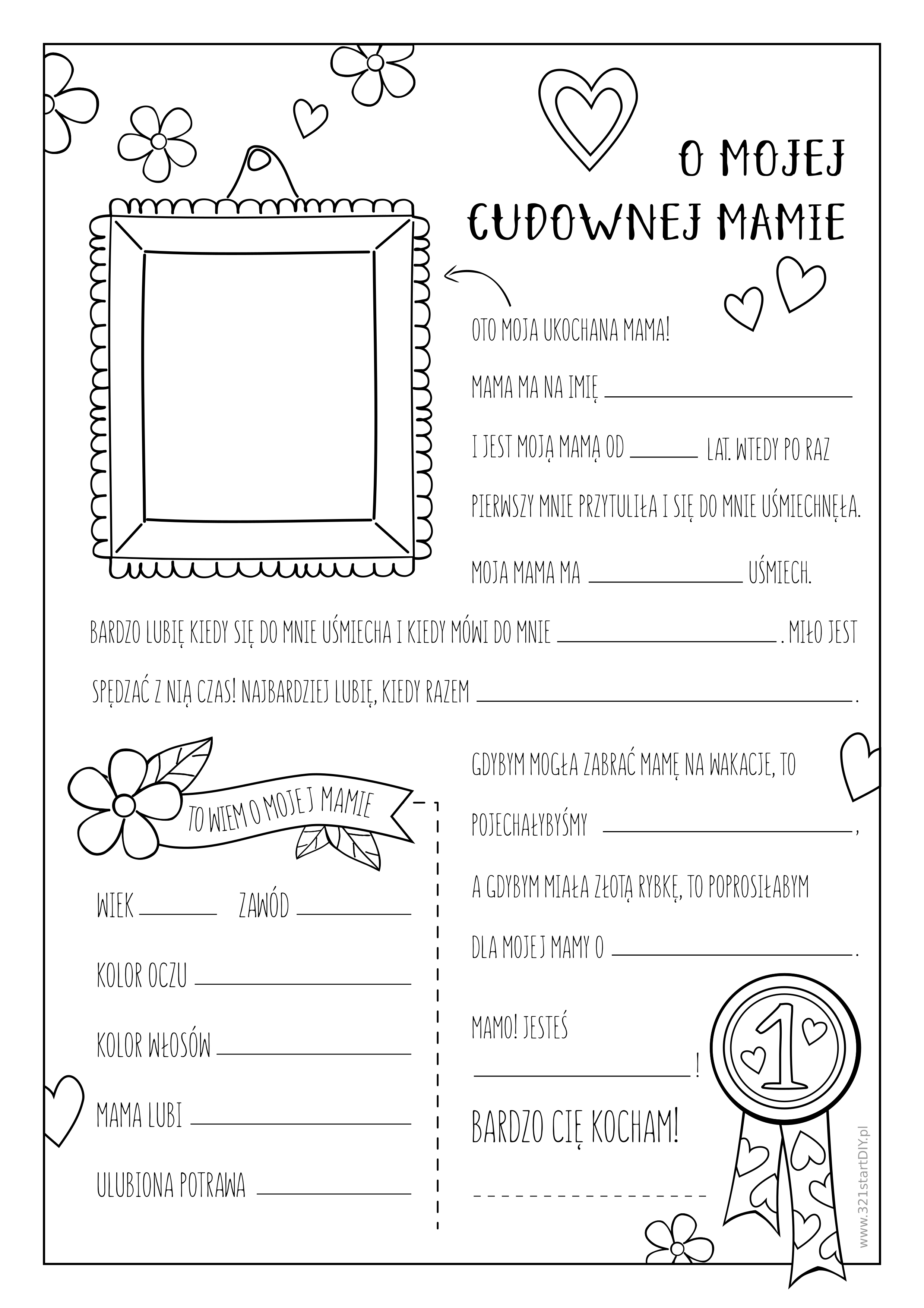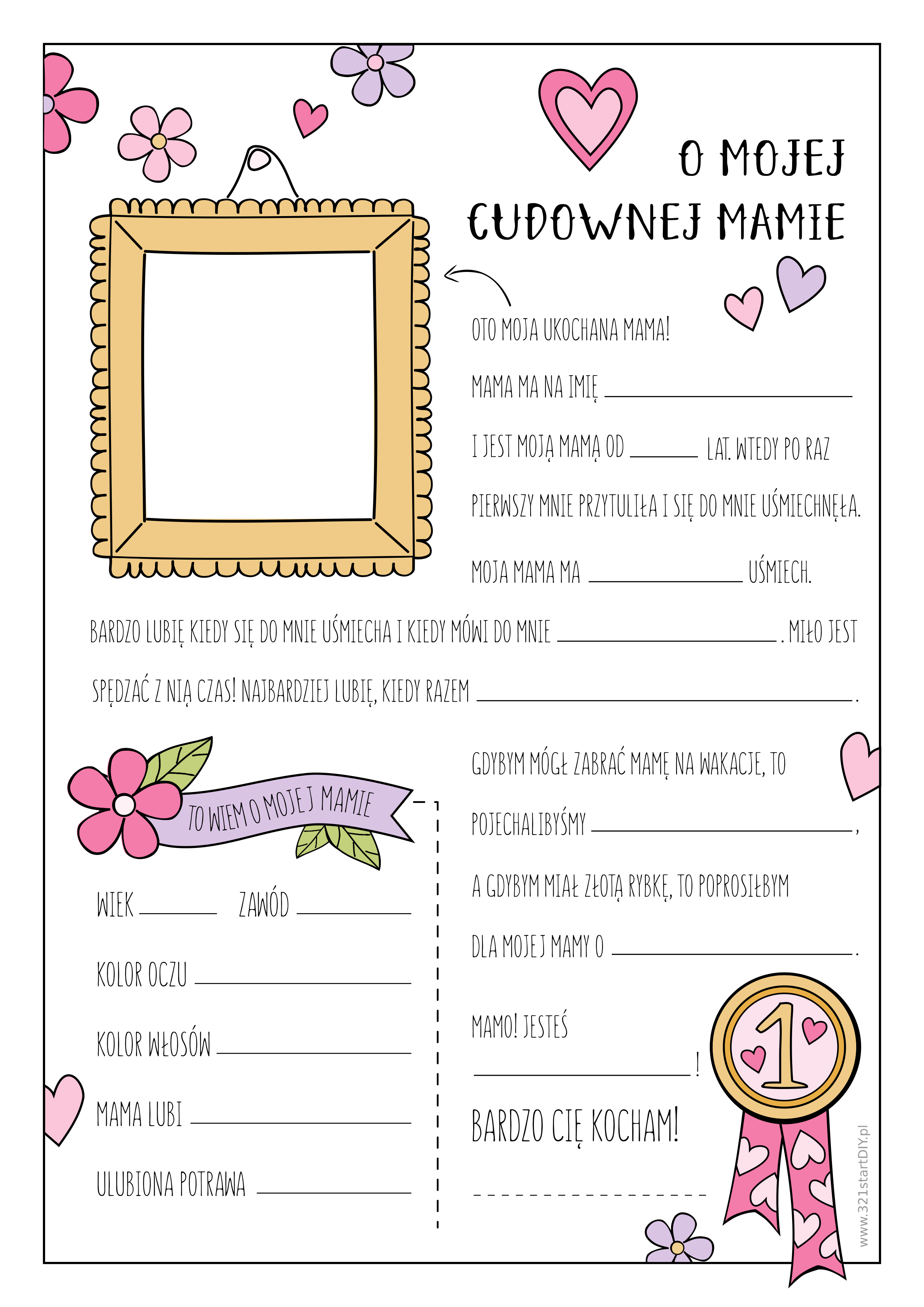 Dzień Mamy to taki wyjątkowy dzień w roku, w którym dzieci z przyjemnością sprawiają mamom niespodzianki. Idąc tym tropem, przygotowałam dla dzieci formularze do uzupełnienia. Myślę, że każda mama z ciekawością się dowie, co synek czy córka zamówiliby dla niej od złotej rybki czy gdzie zabraliby mamę na wakacje. Jest miejsce na portret mamy, a także krótka rubryczka: to wiem o mojej mamie. Wszystko w dwóch wersjach – do kolorowania i kolorowej.