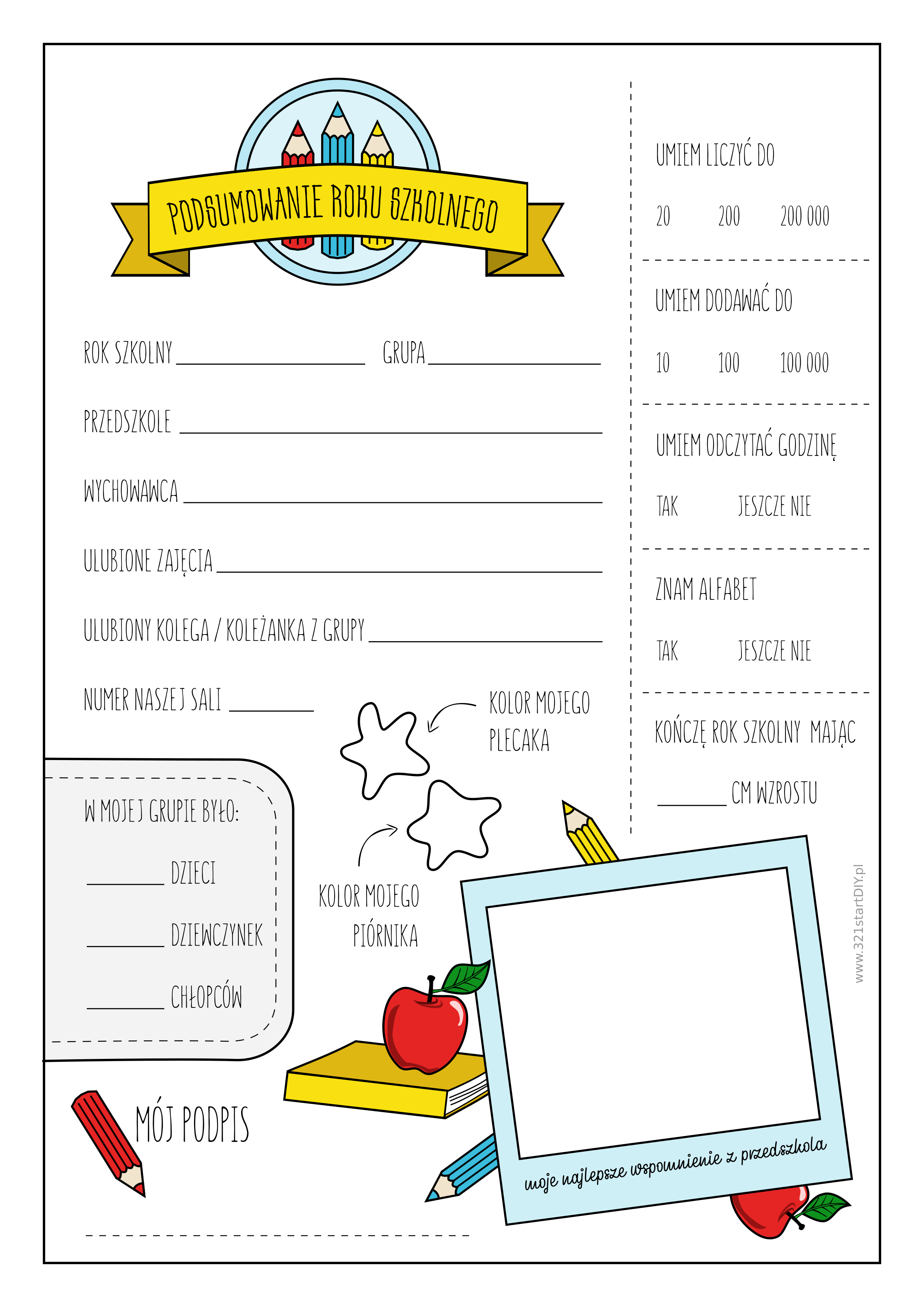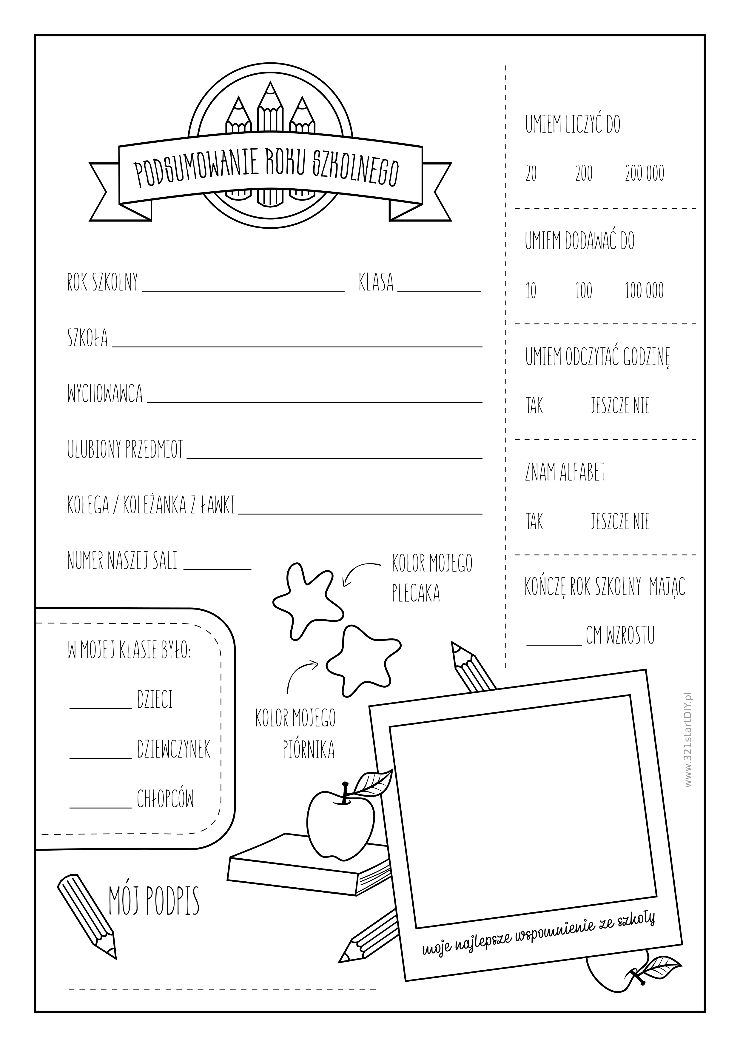 Tak więc, aby pomóc dzieciakom nie zapomnieć i aby mogły zachować wspomnienia na dłużej, przygotowałam formularz z podsumowaniem roku szkolnego. Dzięki niemu dziecko uwieczni nie tylko swój charakter pisma, ale również takie informacje jak numer sali, kolor plecaka i piórnika, kolegę z ławki, swój wzrost czy nazwisko wychowawczyni.