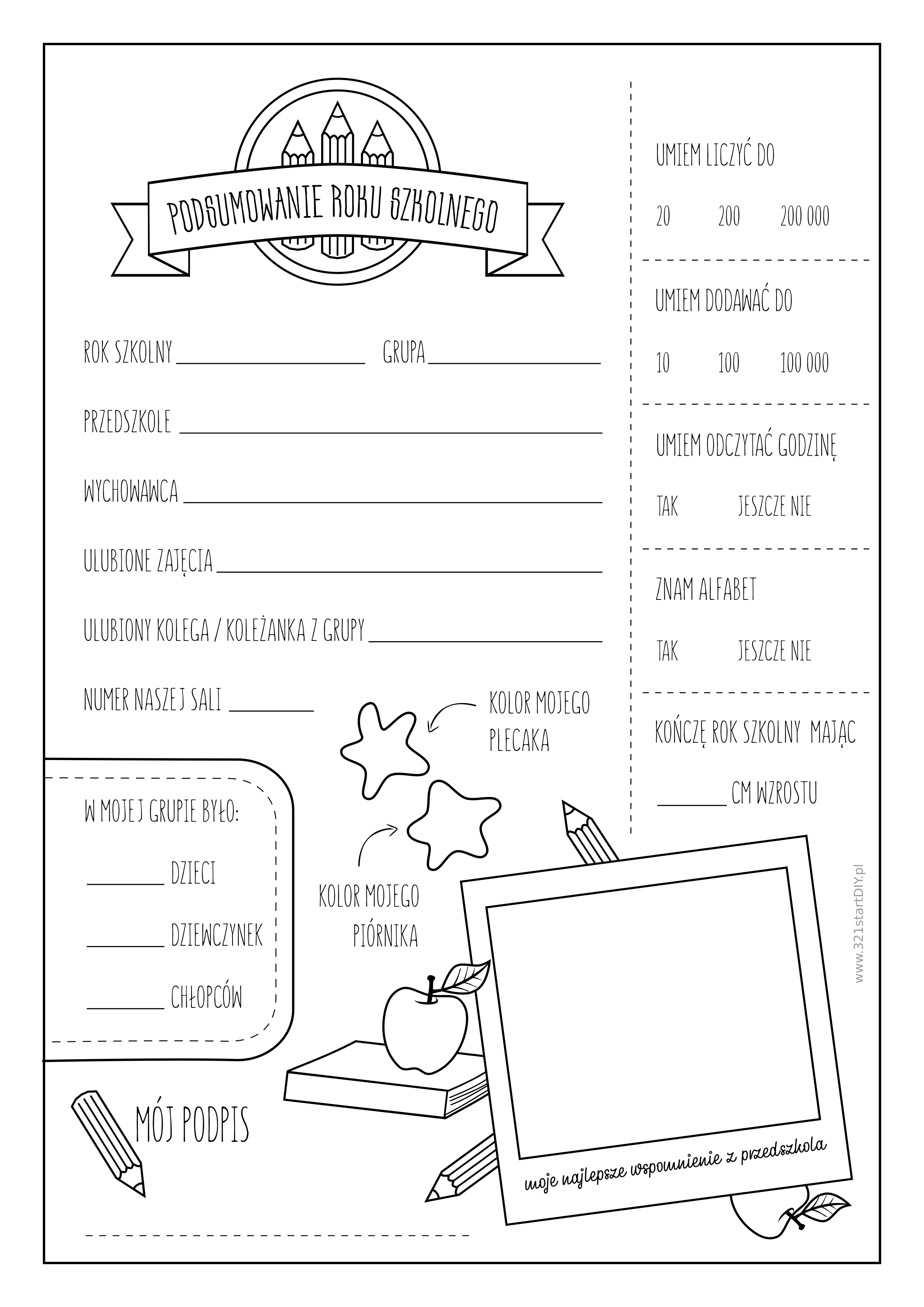 Wakacje coraz bliżej. Po 10 miesiącach nauki w końcu nadeszła pora na upragniony odpoczynek i zaraz rok szkolny będzie tylko wspomnieniem. Aby zachować te wspomnienie na dłużej, przygotowałam formularz z podsumowaniem roku szkolnego, dzięki czemu dzieci uwiecznią na zawsze kilka informacji, najlepsze wspomnienie z tego roku, a także kolor swojego tegorocznego plecaka 🙂 Do wyboru są dwie wersje – kolorowa i do kolorowania.